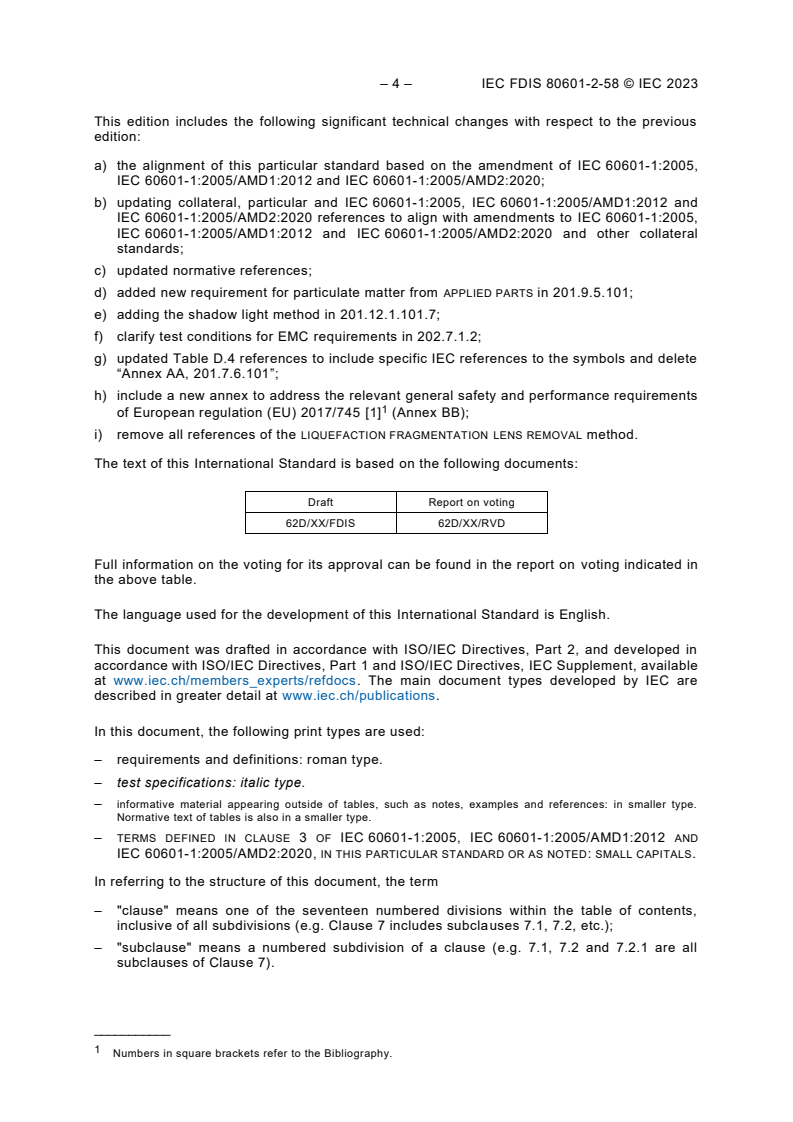 This document applies to the BASIC SAFETY and ESSENTIAL PERFORMANCE of LENS REMOVAL DEVICES and VITRECTOMY DEVICES for ophthalmic surgery (as defined in 201.3.209 and 201.3.217) and associated ACCESSORIES that can be connected to this MEDICAL ELECTRICAL EQUIPMENT, hereafter referred to as ME EQUIPMENT. If a clause or subclause is specifically intended to be applicable to ME EQUIPMENT only, or to ME SYSTEMS only, the title and content of that clause or subclause will say so. If that is not the case, the clause or subclause applies both to ME EQUIPMENT and to ME SYSTEMS, as relevant. HAZARDS inherent in the intended physiological function of ME EQUIPMENT or ME SYSTEMS within the scope of this document are not covered by specific requirements in this document except in 7.2.13 of IEC 60601-1:2005 and IEC 60601 1:2005/AMD2:2020 and 8.4.1 of IEC 60601-1:2005. IEC 80601-2-58:2024 cancels and replaces the second edition published in 2014 and its Amendment 1:2016. This edition constitutes a technical revision. This edition includes the following significant technical changes with respect to the previous edition: a) the alignment of this particular standard based on the amendment of IEC 60601-1:2005, IEC 60601-1:2005/AMD1:2012 and IEC 60601-1:2005/AMD2:2020; b) updating collateral, particular and IEC 60601-1:2005, IEC 60601-1:2005/AMD1:2012 and IEC 60601-1:2005/AMD2:2020 references to align with amendments to IEC 60601-1:2005, IEC 60601-1:2005/AMD1:2012 and IEC 60601-1:2005/AMD2:2020 and other collateral standards; c) updated normative references; d) added new requirement for particulate matter from APPLIED PARTS in 201.9.5.101; e) adding the shadow light method in 201.12.1.101.7; f) clarify test conditions for EMC requirements in 202.7.1.2; g) updated Table D.4 references to include specific IEC references to the symbols and delete “Annex AA, 201.7.6.101”; h) include a new annex to address the relevant general safety and performance requirements of European regulation (EU) 2017/745 (Annex BB); i) remove all references of the LIQUEFACTION FRAGMENTATION LENS REMOVAL method.