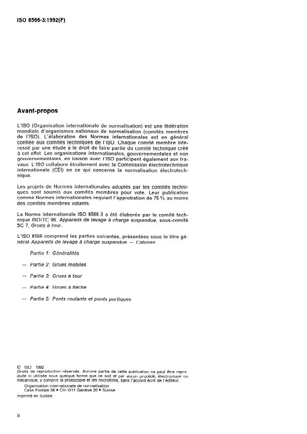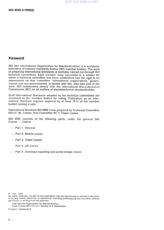 ISO 8566-3:1992 is a standard published by the International Organization for Standardization (ISO). Its full title is "Cranes — Cabins — Part 3: Tower cranes". This standard covers: Establishes the requirements for cabin construction, control station, control elements and noise for cranes as defined in ISO 4306-3.