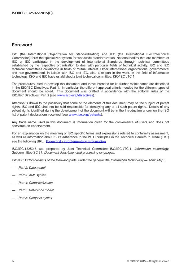 ISO/IEC 13250-5:2015 is a standard published by the International Organization for Standardization (ISO). Its full title is "Information technology - Topic Maps - Part 5: Reference model". This standard covers: ISO/IEC 13250-5:2015 specifies a formal model for subject maps, minimal access functionality and information retrieval from subject maps and a constraint framework governing the interpretation of subject maps. Particular formalisms to constrain subject maps are not covered by this part of ISO/IEC 13250.