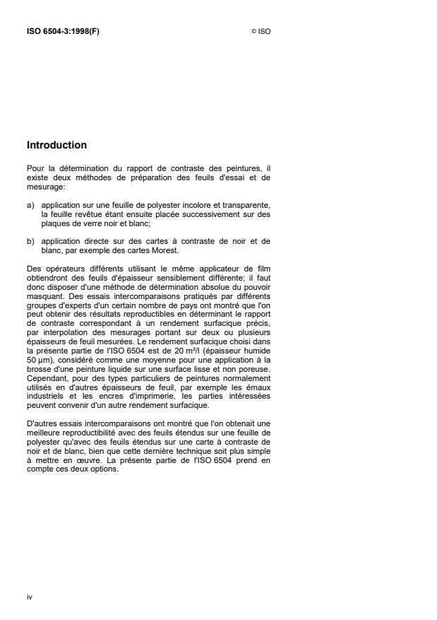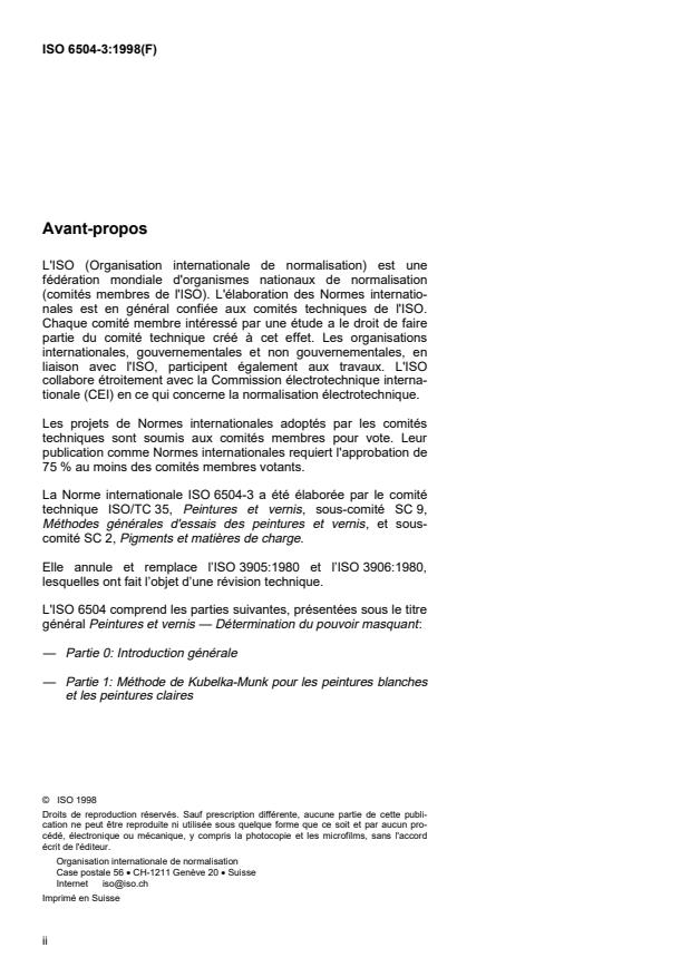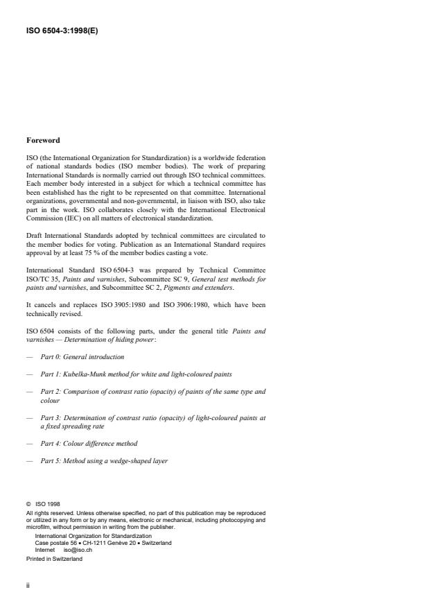 ISO 6504-3:1998 is a standard published by the International Organization for Standardization (ISO). Its full title is "Paints and varnishes — Determination of hiding power — Part 3: Determination of contrast ratio (opacity) of light-coloured paints at a fixed spreading rate". This standard covers: Paints and varnishes — Determination of hiding power — Part 3: Determination of contrast ratio (opacity) of light-coloured paints at a fixed spreading rate