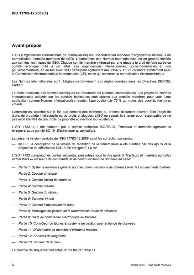L'ISO 11783 dans son ensemble spécifie un réseau de données en série pour la commande et les communications sur les tracteurs forestiers ou agricoles et les équipements portés, semi-portés, tractés ou automoteurs. Elle vise à normaliser la méthode et le format du transfert de données entre capteurs, actionneurs, dispositifs de commande, et unités de stockage et d'affichage de données, que ces éléments soient montés sur le tracteur ou qu'ils fassent partie du tracteur ou de tout autre outil. L'ISO 11783-12:2009 décrit le système de diagnostic du réseau.