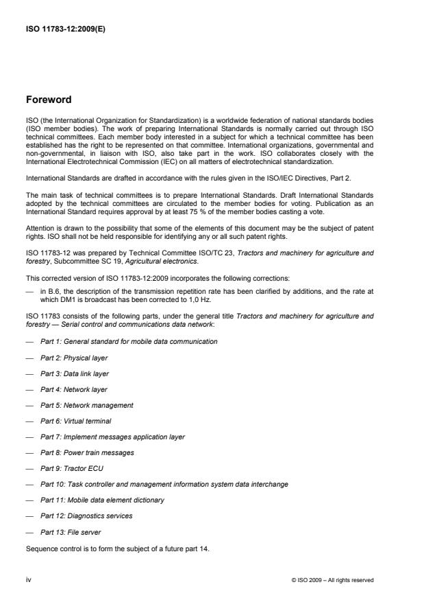 ISO 11783-12:2009 is a standard published by the International Organization for Standardization (ISO). Its full title is "Tractors and machinery for agriculture and forestry — Serial control and communications data network — Part 12: Diagnostics services". This standard covers: ISO 11783 as a whole specifies a serial data network for control and communications on forestry or agricultural tractors and mounted, semi‑mounted, towed or self-propelled implements. Its purpose is to standardize the method and format of transfer of data between sensors, actuators, control elements and information-storage and information-display units, whether mounted on, or part of, the tractor or implement. ISO 11783-12:2009 describes the diagnostic system of a serial data network.