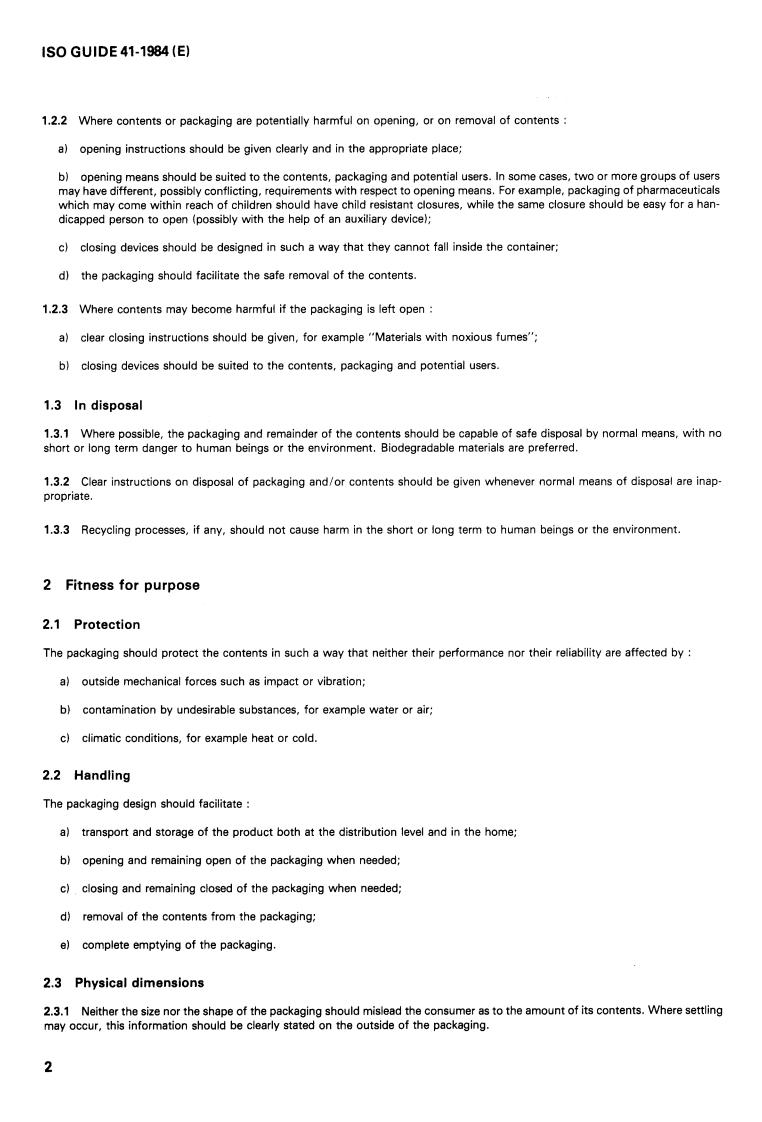 ISO Guide 41:1984 is a guide published by the International Organization for Standardization (ISO). Its full title is "Guide for packaging — Recommendations to comply with consumer needs and protection". This standard covers: Packaging is a product of consumer interest, the cost of which is borne indirectly by the consumer. Standardization of packaging should, therefore, address itself to such factors as safety, health, fitness of purpose, comfort and reliability, as well as such general needs as protection of the environment and energy conservation. When drafting a standard relating to packaging, the requirements set out in this Guide in the order of priority should be taken into consideration.