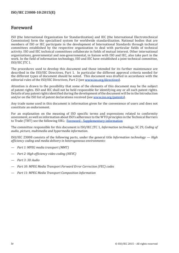 ISO/IEC 23008-10:2015 is a standard published by the International Organization for Standardization (ISO). Its full title is "Information technology - High efficiency coding and media delivery in heterogeneous environments - Part 10: MPEG media transport forward error correction (FEC) codes". This standard covers: ISO/IEC 23008-10 specifies application level forward error correction (FEC) codes which can be used with AL-FEC framework of ISO/IEC 23008‑1 MPEG Media Transport to provide reliable delivery in IP network and non IP network environments that are prone to packet losses.
