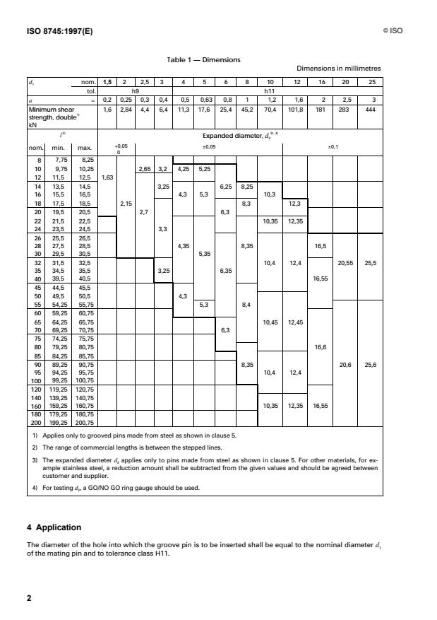 ISO 8745:1997 defines the characteristics of half-length taper grooved pins used as fasteners in mechanical assemblies. The standard covers pins made of steel and austenitic stainless steel with three equally spaced longitudinal grooves and nominal diameters from 1.5 mm to 25 mm inclusive. The displaced material from the grooves forms an expanded diameter that produces a non-positive locking fit when the pin is pressed into a hole of the nominal diameter.