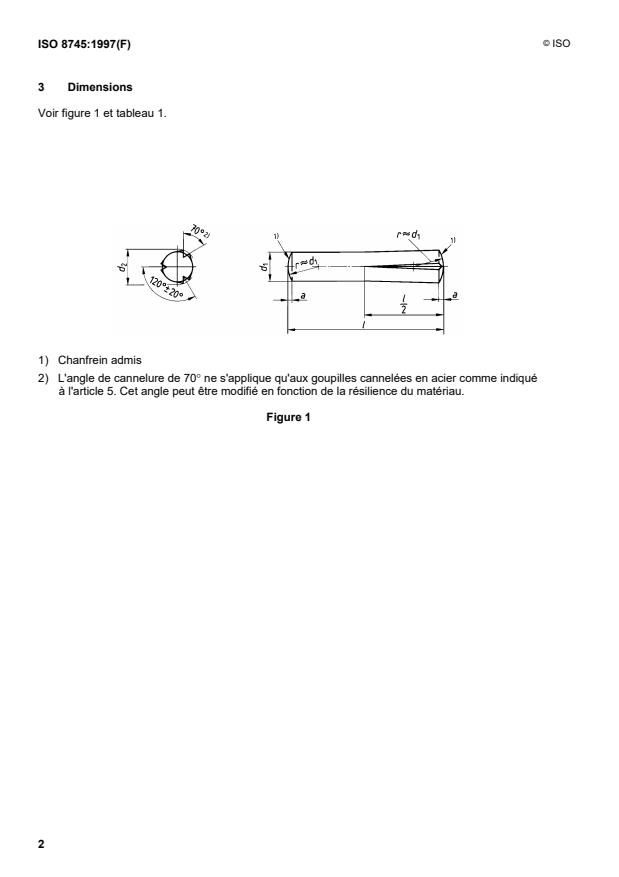 ISO 8745:1997 is a standard published by the International Organization for Standardization (ISO). Its full title is "Grooved pins - Half-length taper grooved". This standard covers: La présente Norme internationale prescrit les caractéristiques des goupilles cannelées en acier ou en acier inoxydable austénitique, à trois cannelures progressives sur la moitié de leur longueur, débouchantes d'un côté et régulièrement espacées, de diamètre nominal, d1, de 1,5 mm à 25 mm inclus. Le matériau refoulé de chaque côté des cannelures forme un renflement dont le diamètre d2, supérieur au diamètre nominal d1, permet un ajustement serré de ces goupilles cannelées lorsqu'elles sont emmanchées en force dans un trou de diamètre de perçage égal au diamètre nominal de la goupille d1 (voir article 4).