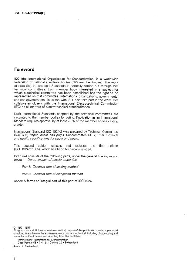 ISO 1924-2:1994 is a standard published by the International Organization for Standardization (ISO). Its full title is "Paper and board — Determination of tensile properties — Part 2: Constant rate of elongation method". This standard covers: Cancels and replaces the first edition (1985). Specifies a method of measuring the tensile strength, stretch at break and tensile energy absorption of paper and board using a test instrument operating at a constant rate of elongation. Also specifies methods for calculating the tensile index, the tensile energy absorption index and the modulus of elasticity. Applies to all papers and boards, including papers with a high stretch at break if the results are within the capacity of the test instrument. Also applies to the components of corrugated board but not, however, to corrugated board itself.