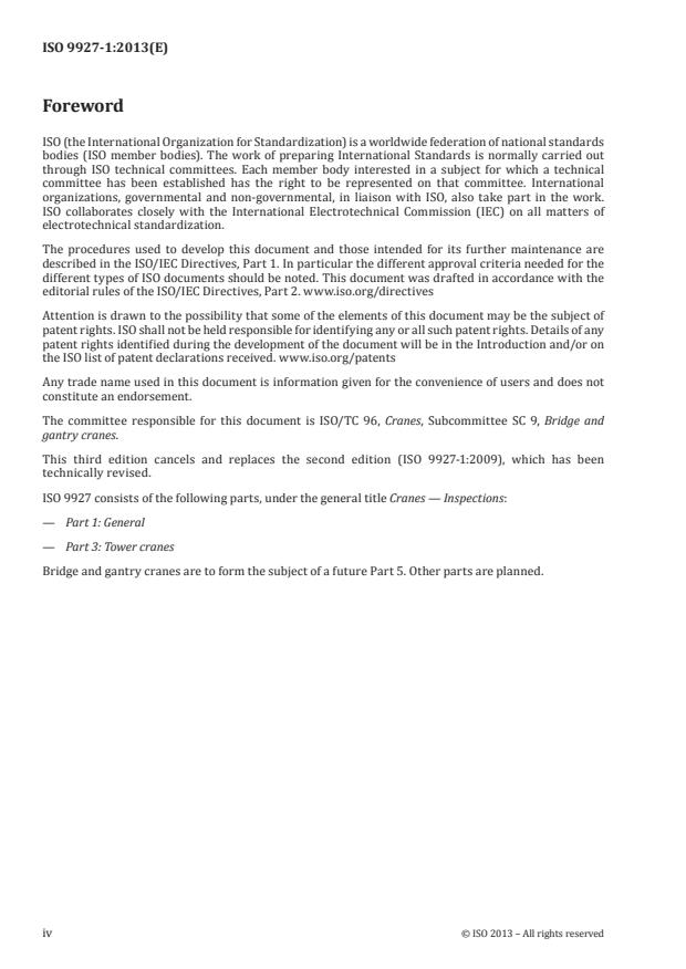 ISO 9927-1:2013 is a standard published by the International Organization for Standardization (ISO). Its full title is "Cranes - Inspections - Part 1: General". This standard covers: ISO 9927:2013 specifies the general requirements for inspections to be carried out on cranes as defined in ISO 4306‑1. Additional requirements for particular types of cranes are intended to be covered by the relevant specific parts of ISO 9927.