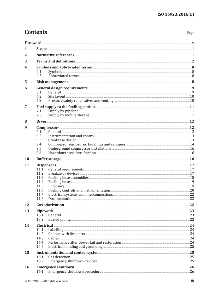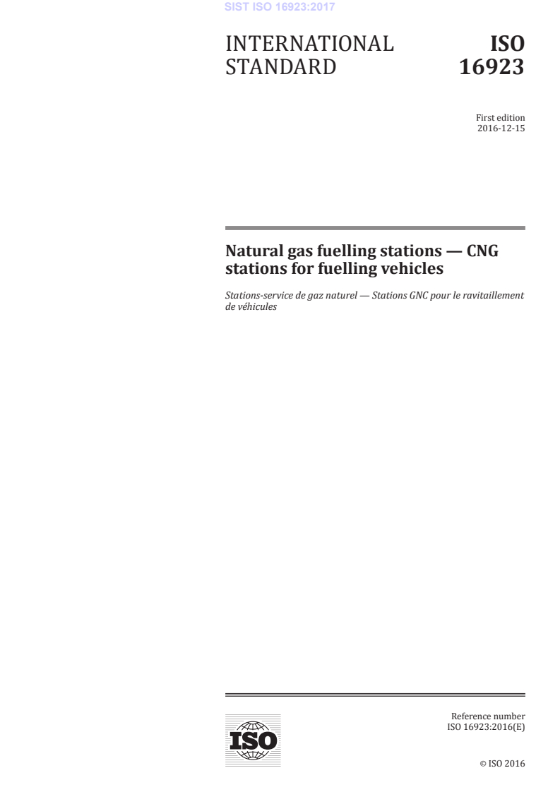 Keywords: ISO 16923:2016, CNG stations, natural gas fuelling stations, LCNG, buffer storage, compressors, dispensers, gas detection, emergency shutdown, station design, operation, maintenance.