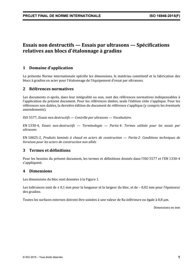 L'ISO 16946:2015 spécifie les dimensions, le matériau constitutif et la fabrication des blocs à gradins en acier pour l'étalonnage des appareils de contrôle par ultrasons.