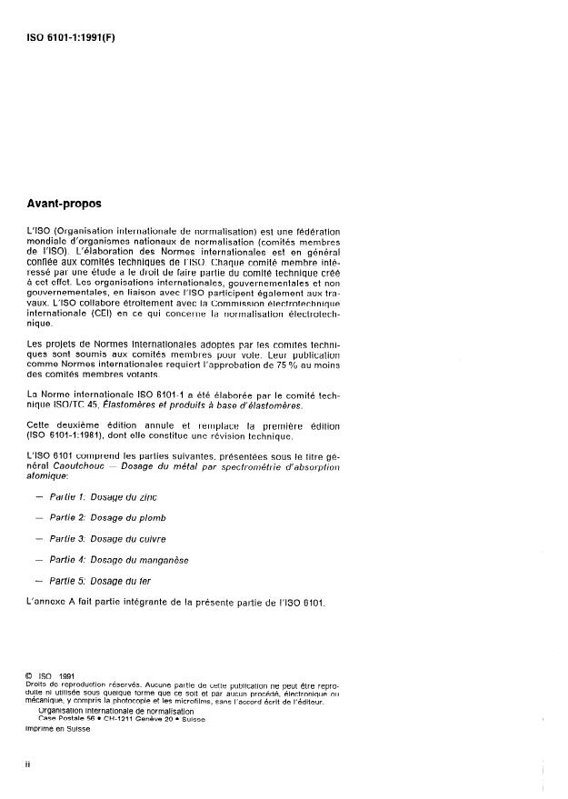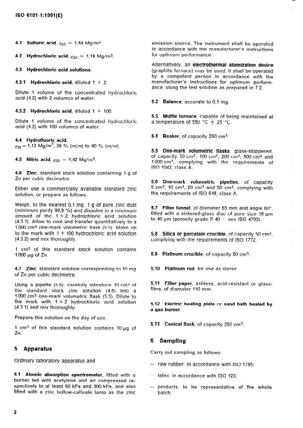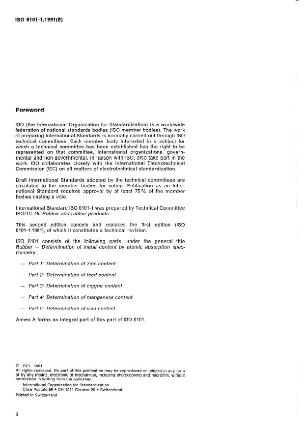 ISO 6101-1:1991 is a standard published by the International Organization for Standardization (ISO). Its full title is "Rubber — Determination of metal content by atomic absorption spectrometry — Part 1: Determination of zinc content". This standard covers: Applies to raw rubber and rubber products having zinc contents at a minimum of 0,05 %. This second edition cancels and replaces the first edition (1981). Annex A forms an integral part of this standard.