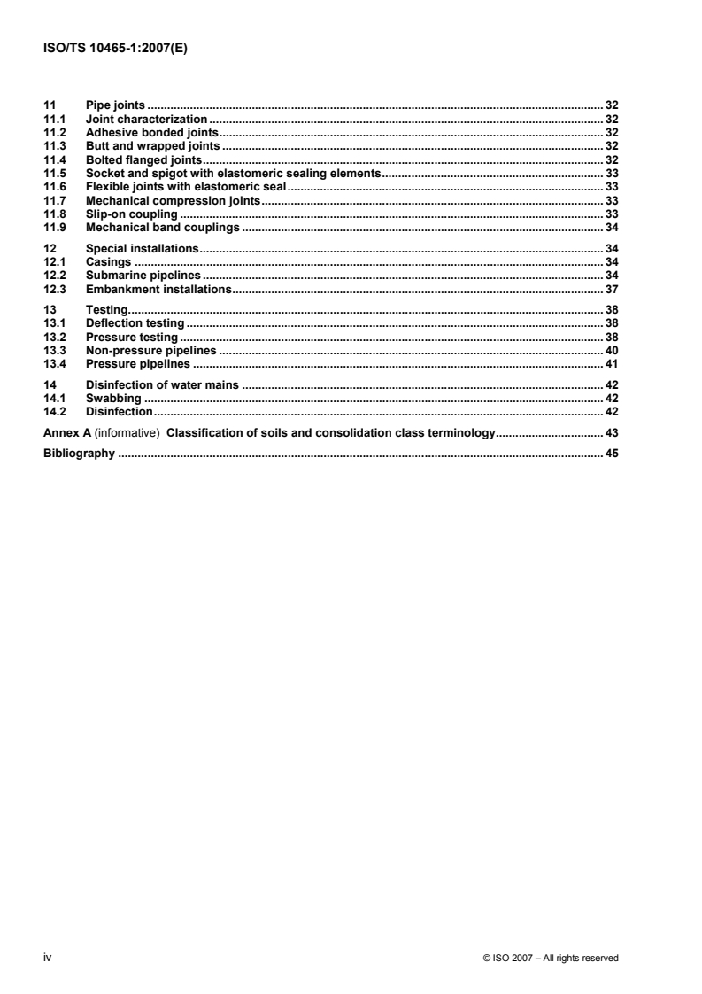 ISO/TS 10465-1:2007 is a technical specification published by the International Organization for Standardization (ISO). Its full title is "Underground installation of flexible glass-reinforced pipes based on unsaturated polyester resin (GRP-UP) - Part 1: Installation procedures". This standard covers: ISO/TS 10465-1:2007 describes the procedures for underground installation of flexible glass-reinforced thermosetting resin (GRP) pipes. It refers generally to GRP pipes as specified in the system standards ISO 10467 and ISO 10639, but it can also be used as a guide for the installation of other GRP pipes. It does not include jacking, relining or above-ground installations; nor does it cover health and safety or environmental conditions, these being addressed in national regulations at the place of installation.