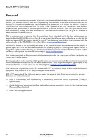 ISO/TS 16975-2:2016 is a technical specification published by the International Organization for Standardization (ISO). Its full title is "Respiratory protective devices - Selection, use and maintenance - Part 2: Condensed guidance to establishing and implementing a respiratory protective device programme". This standard covers: ISO/TS 16975-2:2016 provides brief guidance to assist persons responsible for establishing and implementing a programme for respiratory protective devices (RPD) that meet the performance requirements. There are special applications where the selection of suitable RPD using this guide is not appropriate. These are: a) Fire Fighting ? structural and wildland firefighting, hazardous materials and rescue applications; b) CBRN (Chemical, Biological, Radiological and Nuclear agents); c) Marine ? shipboard or off-shore firefighting or hazardous materials applications; d) Mining ? underground mining or firefighting and rescue applications; and e) Escape ? general, fire, CBRN, marine and mining. NOTE 1 For more detailed information relating to the special applications, refer to ISO/TS 16975‑1. This guidance does not apply to selecting RPD against bio aerosols. NOTE 2 Reference [3] addresses selection of RPD for bio aerosols that are capable of causing infection or adverse or allergic response but for which no occupational exposure limits have been established. This guidance does not apply to RPD programmes for RPD used exclusively under water, in aircraft, and medical life support respirators and resuscitators.