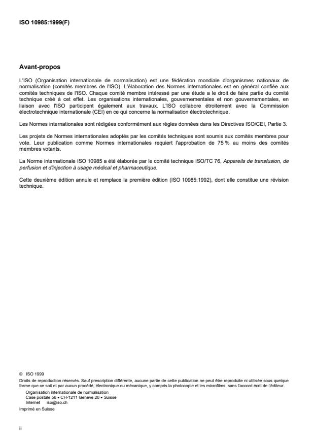 La Norme internationale ISO 10985 a été élaborée par le comité technique ISO/TC 76, Appareils de transfusion, de
