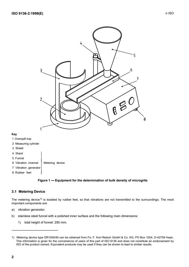 - Equipment: A metering device (vibration-fed funnel and horizontal vibration channel), a polished measuring cylinder and an overspill tray with shield. Example funnel and channel dimensions are provided in the standard to ensure repeatable metering.