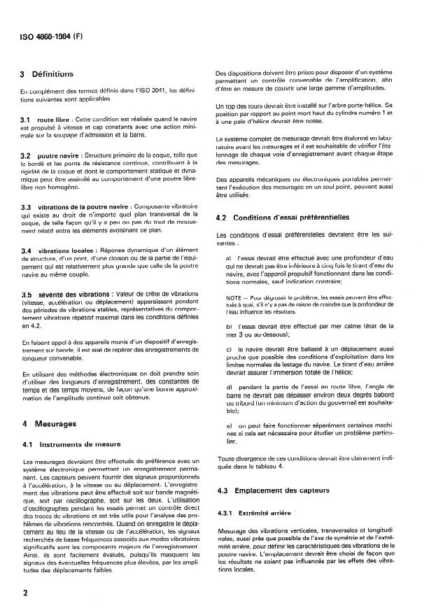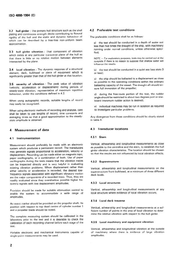 ISO 4868:1984 is a standard published by the International Organization for Standardization (ISO). Its full title is "Code for the measurement and reporting of local vibration data of ship structures and equipment". This standard covers: Establishes uniform procedures for gathering and presenting data of local structural elements, superstructures, decks, bulkheads, masts, machines, foundations in sea-going merchant ships. Gives general principles of vibration measurement to improve vibration engineering.