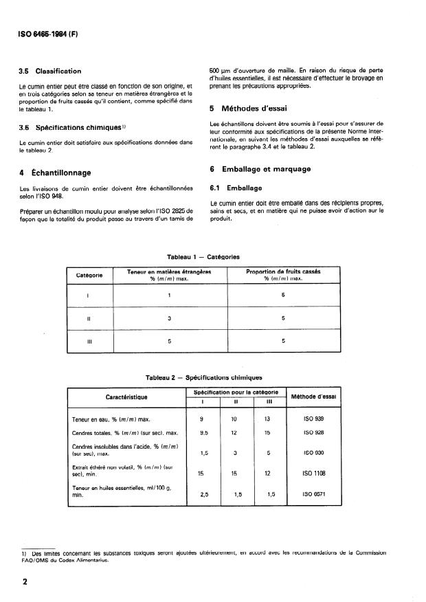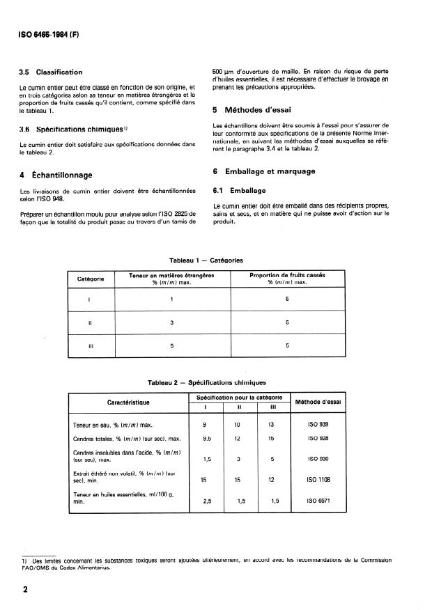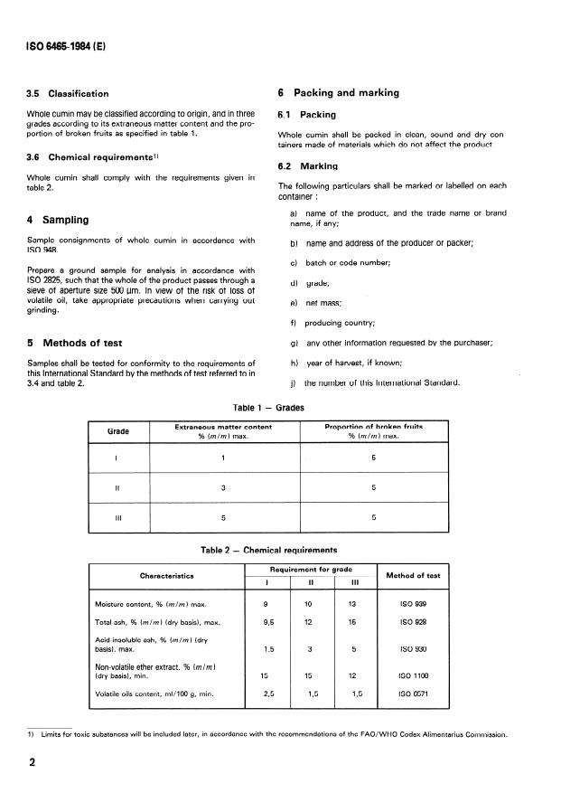 ISO 6465:1984 is a standard published by the International Organization for Standardization (ISO). Its full title is "Whole cumin (Cuminum cyminum Linnaeus) — Specification". This standard covers: Covers the requirements for this product with regard to whole-sale purposes, describes sampling, methods of test, and packing and marking. Grades and chemical requirements are indicated in two tables. An annex includes recommandations relating to storage and transport conditions.