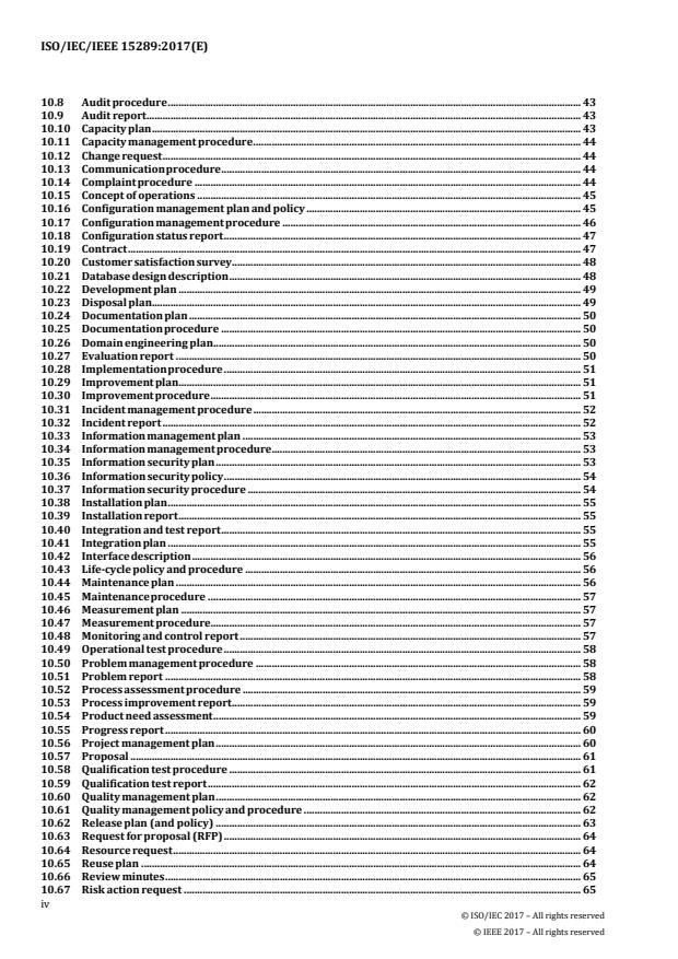 ISO/IEC/IEEE 15289:2017 is a standard published by the International Organization for Standardization (ISO). Its full title is "Systems and software engineering — Content of life-cycle information items (documentation)". This standard covers: ISO/IEC/IEEE 15289:2017 specifies the purpose and content of all identified systems and software life-cycle and service management information items (documentation). The information item contents are defined according to generic document types, as presented in Clause 7, and the specific purpose of the document (Clause 10). ISO/IEC/IEEE 15289:2017 assumes an organization is performing life-cycle processes, or practicing service management, using one or more of the following: - ISO/IEC 12207:2008 (IEEE Std 12207-2008), Systems and software engineering ? Software life cycle processes; - ISO/IEC/IEEE 15288:2015, Systems and software engineering ? System life cycle processes; - ISO/IEC 20000-1:2011 (IEEE Std 20000-1:2013), Information technology ? Service management ? Part 1: Service management system requirements; and - ISO/IEC 20000-2 (IEEE Std 20000-2:2013), Information technology ? Service management ? Part 2: Guidance on the application of service management systems. ISO/IEC/IEEE 15289:2017 provides a mapping of processes from the above standards to a set of information items. It provides a consistent approach to meeting the information and documentation requirements of systems and software engineering and IT service management. ISO/IEC/IEEE 15289:2017 does not establish a service management system.