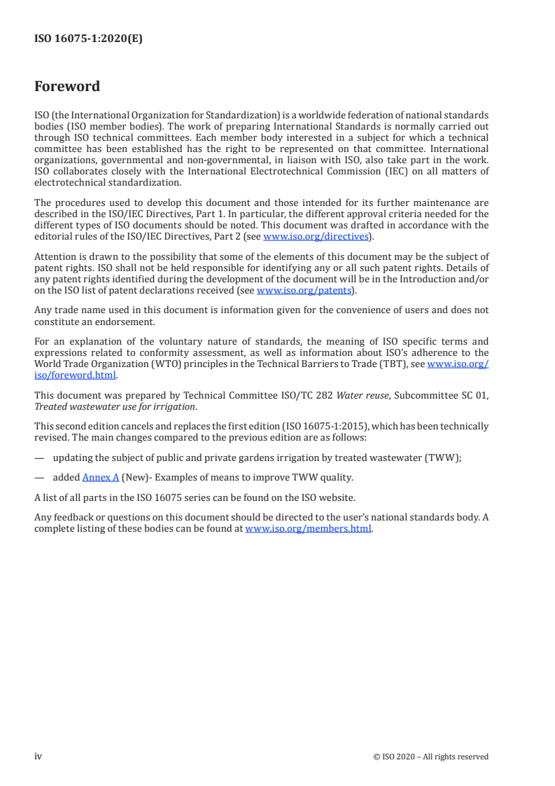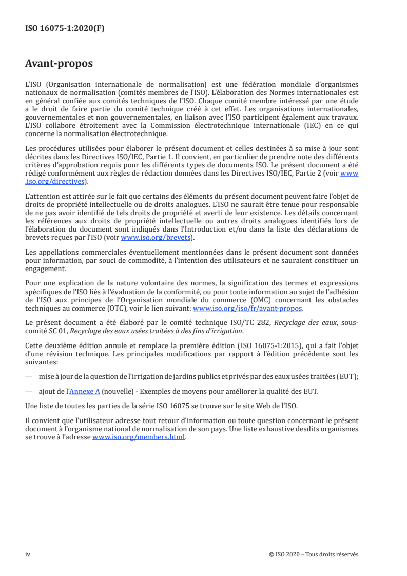 - ISO 16075-1:2020 is part of the ISO 16075 series on treated wastewater reuse and was prepared by ISO/TC 282 Water reuse. Users should consult other parts of the series and local health and regulatory requirements for detailed threshold values and compliance obligations.