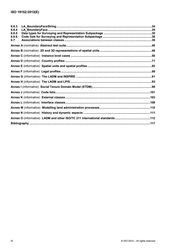 L'ISO 19152:2012: définit un modèle de référence du domaine de l'administration des terres (LADM) qui concerne les composants relatifs aux informations de base sur l'administration des terres (y compris ceux qui se trouvent au-dessus de l'eau et des terres, et les éléments situés au-dessus et en dessous de la surface de la Terre); fournit un modèle conceptuel abstrait composé de quatre paquetages relatifs aux parties (individus et organisations); aux unités administratives de base, droits, responsabilités et restrictions (droits de propriété); aux unités spatiales (parcelles et espace juridique des bâtiments et réseaux publics); aux sources spatiales (relevés topographiques) et représentations spatiales (géométrie et topologie); propose une terminologie pour l'administration des terres, fondée sur divers systèmes nationaux et internationaux, aussi simple que possible afin d'être utile dans la pratique. La terminologie permet d'obtenir une description commune de différentes pratiques et procédures, officielles ou non, dans diverses juridictions; propose une base pour les profils nationaux et régionaux et permet la combinaison cohérente des informations relatives à l'administration des terres issues de différentes sources.