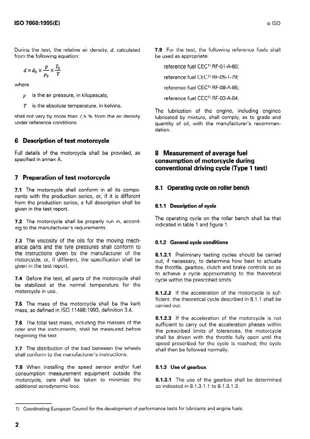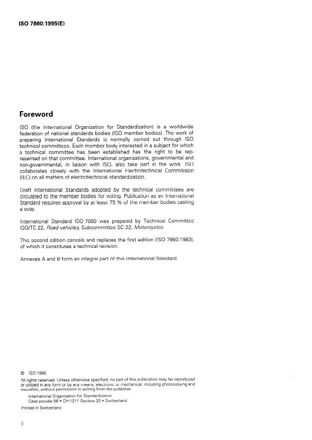 ISO 7860:1995 is a standard published by the International Organization for Standardization (ISO). Its full title is "Motorcycles — Methods of measuring fuel consumption". This standard covers: Specifies methods of determining the fuel consumption of motorcycles. Cancels and replaces the first edition which has been technically revised.