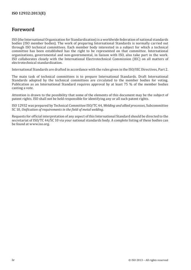 ISO 12932:2013 is a standard published by the International Organization for Standardization (ISO). Its full title is "Welding - Laser-arc hybrid welding of steels, nickel and nickel alloys - Quality levels for imperfections". This standard covers: ISO 12932:2013 specifies quality levels of imperfections in laser-arc hybrid welded joints for all types of steel, nickel and its alloys. It applies to material thickness ≥0,5 mm. Three quality levels are given in order to permit application for a wide range of welded fabrication. They are designated by B, C and D. Quality level B corresponds to the highest requirement on the finished weld. The quality levels refer to production quality and not to the fitness-for-purpose of the product manufactured.