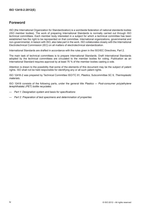 ISO 12418-2:2012 is a standard published by the International Organization for Standardization (ISO). Its full title is "Plastics — Post-consumer poly(ethylene terephthalate) (PET) bottle recyclates — Part 2: Preparation of test specimens and determination of properties". This standard covers: ISO 12418-2:2012 specifies the test methods to be used in determining the properties of post-consumer poly(ethylene terephthalate) (PET) bottle recyclates.
