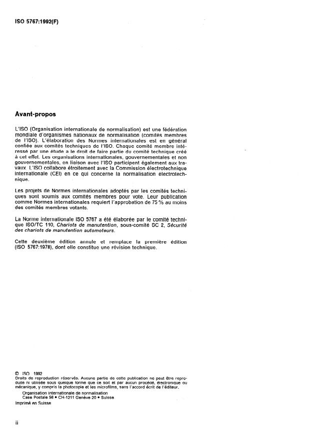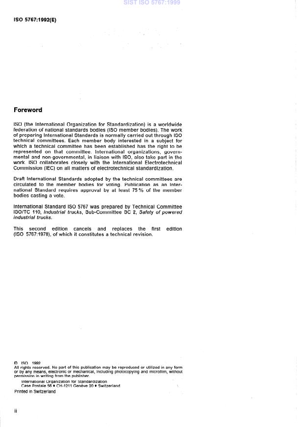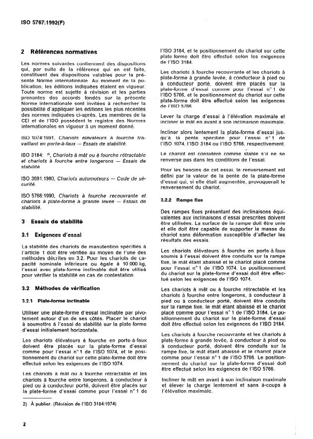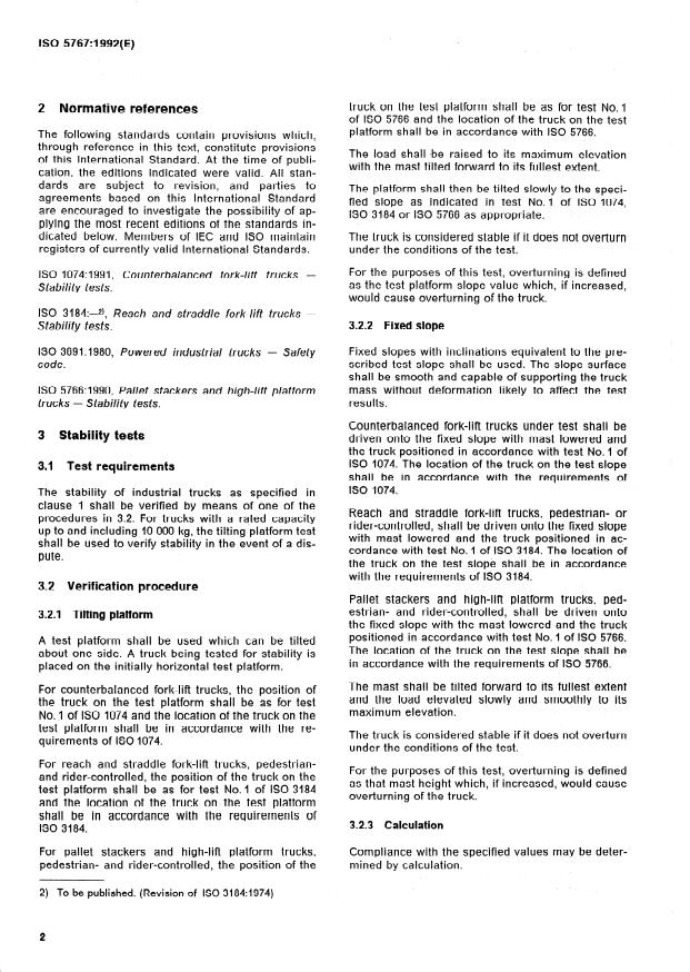 INTERNATIONAL STANDARD ISO 5767:1992(E) Industrial trucks operating in special condition of stacking with mast tilted forward - Additional stability test 1 Scope This International Standard specifies the additional test to verify the stability of trucks stacking from level ground with the mast tilted forward and the load in the elevated Position (see figure 1). lt applies to the following trucks and is in addition to the stability tests applicable to each type of truck under normal operating conditions:l) a) counterbalanced fork-litt trucks with tiltable masts, up to and including 50 000 kg rated ca- pacity; b) resch (retractable mast or forks) and straddle fork-lift trucks with tiltable masts, up to and in- cluding 5 000 kg rated capacity; c) pallet stackers and high-lift platform trucks, with tiltable masts, up to and including 5 000 kg rated capacity. This International Standard does not apply to trucks when handling suspended loads which may Swing freely. Figure 1 1) In the USA the rated capacities of 50 000 kg and 5 000 kg are not applicable. 100 000 Ib and 10 000 Ib respectively, although not equivalent to the kilogram values, are applicable in the USA. 1 SIST ISO 5767:1999