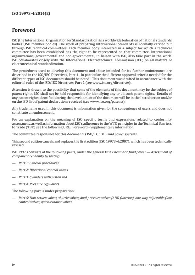 ISO 19973-4:2014 is a standard published by the International Organization for Standardization (ISO). Its full title is "Pneumatic fluid power — Assessment of component reliability by testing — Part 4: Pressure regulators". This standard covers: ISO 19973-4:2014 provides test procedures for assessing the reliability of pneumatic pressure regulators by testing and the methods of reporting the results of testing. General test conditions and the calculation method are provided in ISO 19973-1. The methods specified in ISO 19973-1 apply to the first failure, as obtained with the three-points moving average (3PMA) method, without repairs, but excluding outliers. ISO 19973-4:2014 applies to manually adjustable and remote-piloted pressure regulators, both relieving and non-relieving. It does not apply to pressure regulators that have a permanent bleed. ISO 19973-4:2014 also specifies test equipment and failure criteria (threshold levels) for tests to assess the reliability of pneumatic pressure regulators.