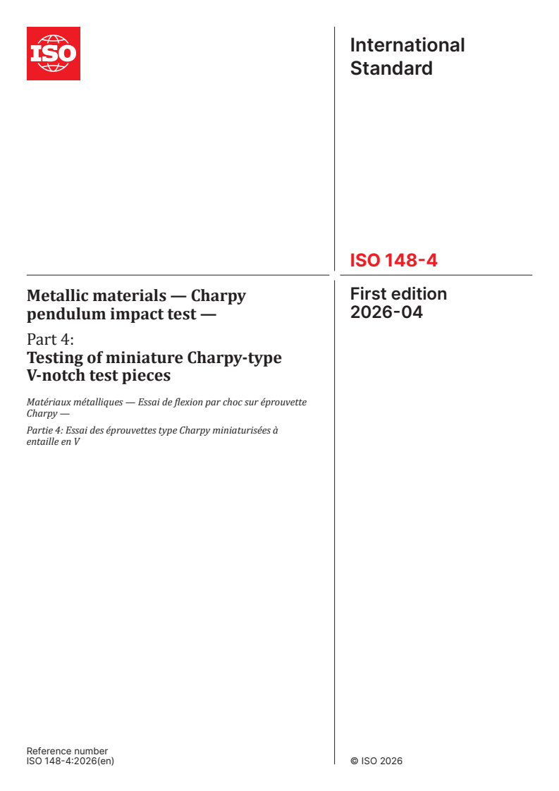 ISO 148-4:2026 is a standard published by the International Organization for Standardization (ISO). Its full title is "Metallic materials — Charpy pendulum impact test — Part 4: Testing of miniature Charpy-type V-notch test pieces". This standard covers: This document specifies the pendulum impact test method on miniature Charpy-type V-notch test pieces of metallic materials. This document does not cover instrumented impact testing of miniature Charpy-type V-notch test pieces, which is specified in ISO 14556:2023, Annex D[1]. This document can be applied, by agreement, to other impact testing machines, such as drop-weight towers or high-speed servo-hydraulic machines. The user should be aware that data obtained from miniature test pieces are not directly comparable to those obtained from full-size standard Charpy V-notch test pieces[2],[3].