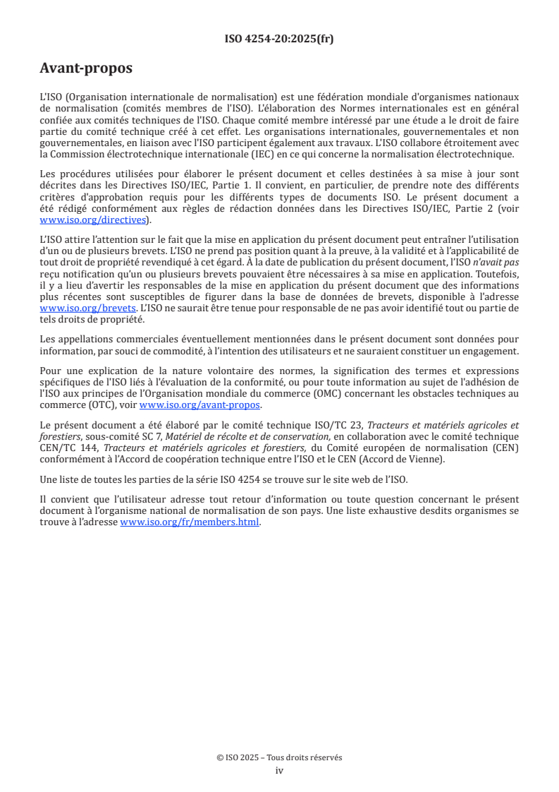 ISO 4254-20:2025 is a standard published by the International Organization for Standardization (ISO). Its full title is "Agricultural machinery - Safety - Part 20: Grape, olives and coffee harvesters". This standard covers: This document, when used together with ISO 4254-1:2013 and ISO 4254-1:2013/AMD1:2021, specifies the safety requirements and their verification for the design and construction of trailed and self-propelled harvesters for grapes, olives and coffee. It describes methods for the elimination or reduction of hazards arising from the intended use of these machines by one person (the operator) in the course of normal operation and service. In addition, it specifies the type of information on safe working practices to be provided by the manufacturer. When provisions of this document are different from those which are stated in ISO 4254-1:2013 and ISO 4254-1:2013/AMD1:2021, the provisions of this document take precedence over the provisions of ISO 4254-1:2013 and ISO 4254-1:2013/AMD1:2021 for machines that have been designed and built according to the provisions of this document. This document, taken together with ISO 4254-1:2013 and ISO 4254-1:2013/AMD1:2021, deals with all the significant hazards, hazardous situations and events relevant to trailed and self-propelled harvesters for grapes, olives and coffee, when they are used as intended and under the conditions of misuse that are reasonably foreseeable by the manufacturer. It is not applicable to hazards arising from the presence of persons other than the operator, hazards related to lack of visibility, except lighting, hazards related to vibrations and moving parts for power transmission, except for strength requirements for guards and barriers. This document does not deal with environmental hazards, except noise. In respect of steering of self-propelled machines, it is applicable only to the ergonomic aspects (for example, location of the steering wheel); no other aspects related to steering are covered. NOTE Specific requirements related to road traffic regulations are not taken into account in this document. This document is not applicable to machines manufactured before the date of its publication.