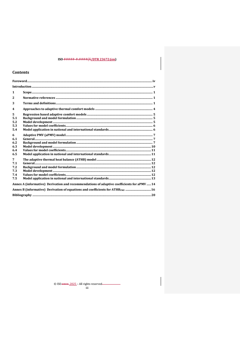 ISO/DTR 23672, published by ISO/TC 159/SC 5, defines adaptive thermal comfort and presents current modelling approaches for achieving thermal comfort in indoor built environments. The document covers mechanisms of thermal adaptation (physiological, behavioural and psychological) and describes three exemplar approaches used to predict adaptive thermal sensation: regression-based adaptive models, the adaptive PMV (aPMV) model, and the Adaptive Thermal Heat Balance (ATHB) framework.