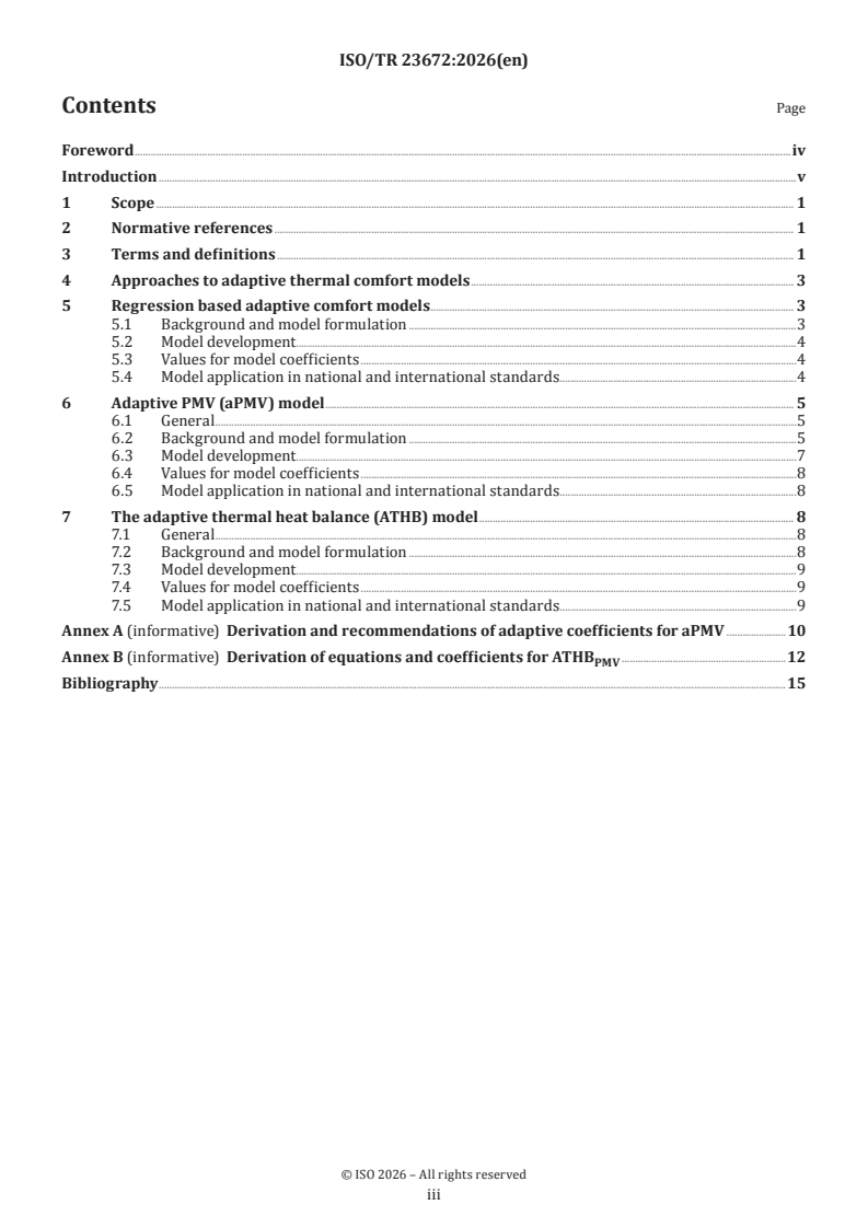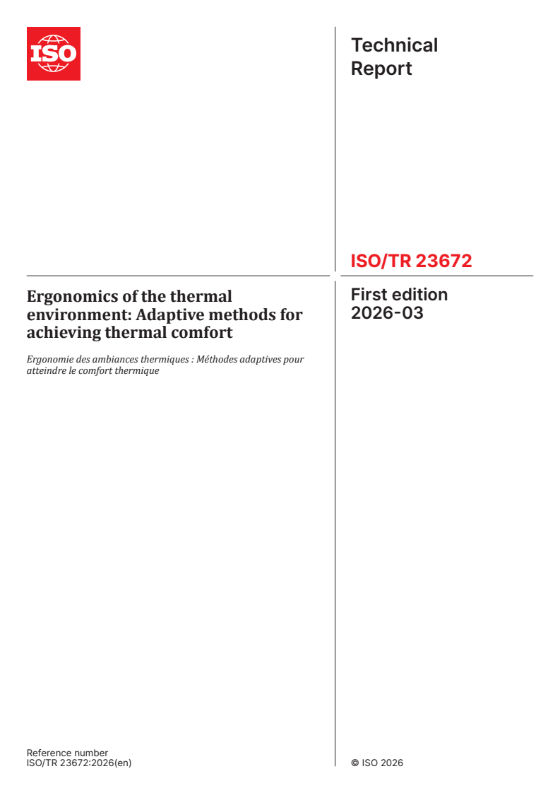 ISO/TR 23672:2026 is a technical report published by the International Organization for Standardization (ISO). Its full title is "Ergonomics of the thermal environment: Adaptive methods for achieving thermal comfort". This standard covers: This document defines adaptive thermal comfort and its mechanisms, and describes current approaches to predict adaptive thermal comfort. This document applies to human thermal comfort in indoor built environments and seasonal adaptive processes. It is applicable to healthy humans exposed to indoor environments where thermal comfort is desirable, but where moderate deviations from thermal comfort occur, in the design of new environments or the assessment of existing ones.