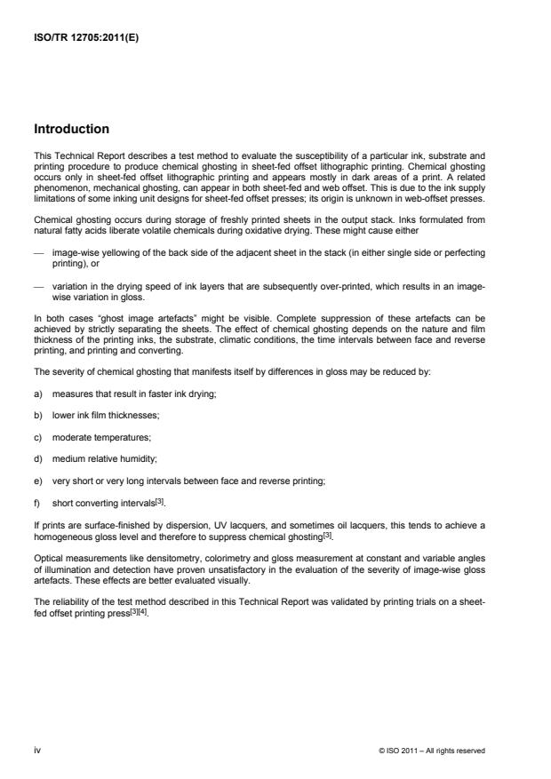 ISO/TR 12705:2011 describes a laboratory method, using a printability tester, for the preparation of specimens in order to evaluate the tendency of a particular ink, substrate and printing procedure to produce chemical ghosting in sheet-fed offset lithography on coated papers or foils. A test procedure to induce ghosting using these specimens is also included. This method applies only to oxidative drying inks on coated papers or foils and it evaluates a particular ink and substrate combination.