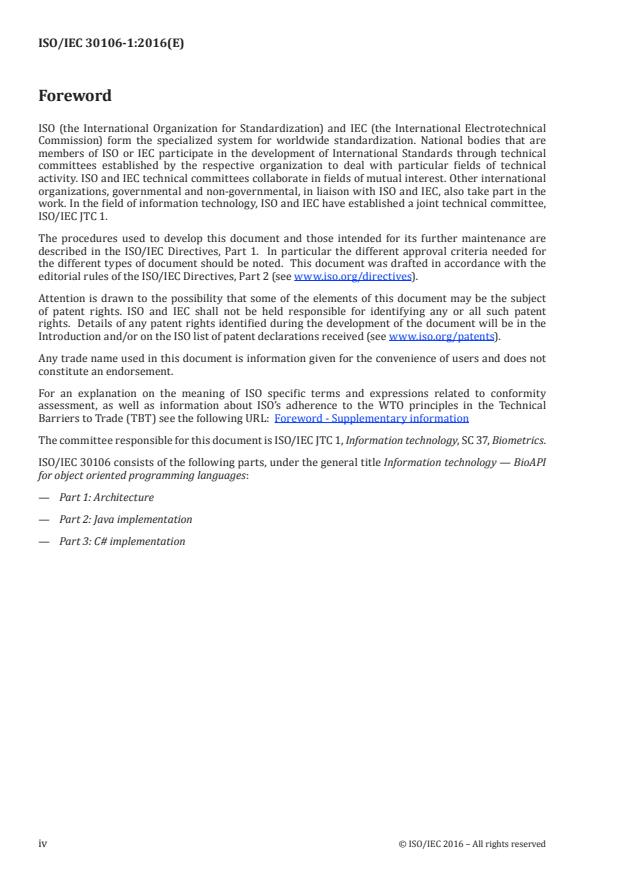 ISO/IEC 30106-1:2016 is a standard published by the International Organization for Standardization (ISO). Its full title is "Information technology - Object oriented BioAPI - Part 1: Architecture". This standard covers: ISO/IEC 30106-1:2016 specifies an architecture for a set of interfaces which define the OO BioAPI. Components defined in this part of ISO/IEC 30106 include a framework, Biometric Service Providers (BSPs), Biometric Function Providers (BFPs) and a component registry. NOTE Each of these components have an equivalent component specified in ISO/IEC 19784‑1 as the OO BioAPI is intended to be an OO interpretation of this part of ISO/IEC 30106. For this reason, this part of ISO/IEC 30106 is conceptually equivalent to ISO/IEC 19784‑1. Concepts present in this part of ISO/IEC 30106 (for example, BioAPI_Unit and component registry) have the same meaning as in ISO/IEC 19784‑1. While the conceptual equivalence of this part of ISO/IEC 30106 will be maintained with ISO/IEC 19784‑1, there are differences in the parameters passed between functions and the sequence of function calls. These differences exist to take advantage of the features provided by Object Oriented Programming Languages.