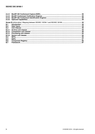 ISO/IEC 30106-1:2016 specifies an architecture for a set of interfaces which define the OO BioAPI. Components defined in this part of ISO/IEC 30106 include a framework, Biometric Service Providers (BSPs), Biometric Function Providers (BFPs) and a component registry. NOTE Each of these components have an equivalent component specified in ISO/IEC 19784‑1 as the OO BioAPI is intended to be an OO interpretation of this part of ISO/IEC 30106. For this reason, this part of ISO/IEC 30106 is conceptually equivalent to ISO/IEC 19784‑1. Concepts present in this part of ISO/IEC 30106 (for example, BioAPI_Unit and component registry) have the same meaning as in ISO/IEC 19784‑1. While the conceptual equivalence of this part of ISO/IEC 30106 will be maintained with ISO/IEC 19784‑1, there are differences in the parameters passed between functions and the sequence of function calls. These differences exist to take advantage of the features provided by Object Oriented Programming Languages.