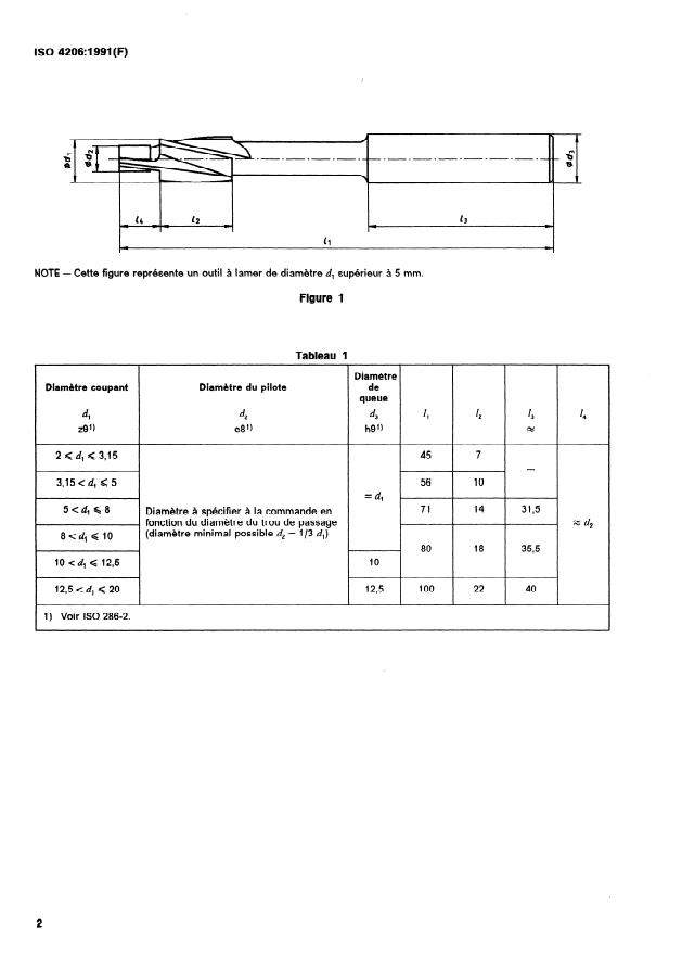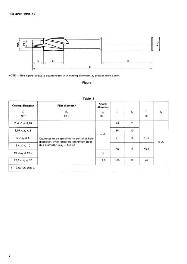 ISO 4206:1991 is a standard published by the International Organization for Standardization (ISO). Its full title is "Counterbores with parallel shanks and solid pilots". This standard covers: Specifies the dimensions and the tolerances as shown in figure 1 and given in table 1. Annex A (Bibliography) is for information only.