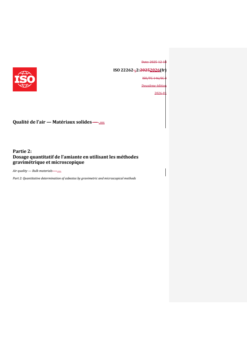 REDLINE ISO 22262-2:2026 - Qualité de l’air — Matériaux solides — Partie 2: Dosage quantitatif de l’amiante en utilisant les méthodes gravimétrique et microscopique Released:6. 02. 2026