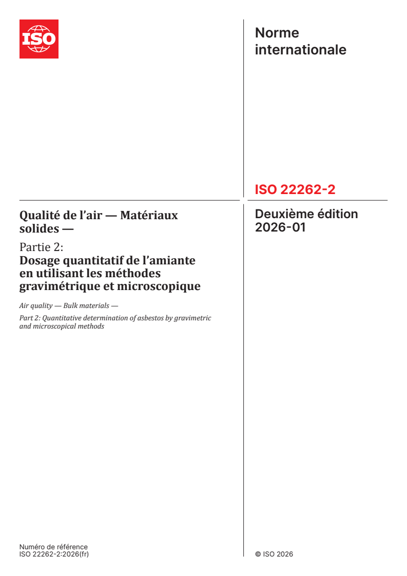ISO 22262-2:2026 - Qualité de l’air — Matériaux solides — Partie 2: Dosage quantitatif de l’amiante en utilisant les méthodes gravimétrique et microscopique Released:6. 02. 2026
