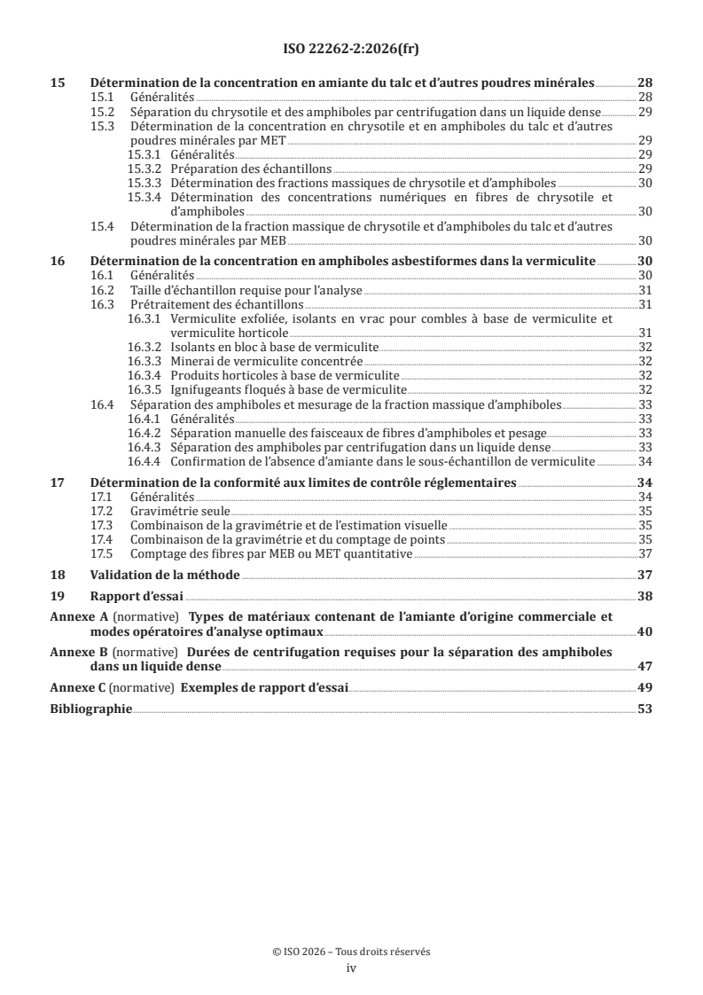 Le présent document spécifie les modes opératoires de quantification des fractions massiques d’amiante inférieures à environ 5 % et les modes opératoires de quantification de l’amiante dans la vermiculite, dans d’autres minéraux industriels et dans les produits commerciaux contenant ces minéraux. Le présent document est applicable à l’analyse quantitative des matériaux suivants: tout matériau pour lequel l’estimation de la fraction massique d’amiante obtenue à l’aide de l’ISO 22262-1 est considérée comme étant insuffisamment précise pour déterminer avec fiabilité le statut réglementaire du matériau (c’est-à-dire si le matériau est soumis ou non à des réglementations sur l’amiante dans la juridiction donnée), ou pour lequel il est nécessaire d’obtenir d’autres preuves pour démontrer l’absence d’amiante; les dalles de sol souples, les matériaux bitumineux, les feutres pour toitures et tout autre matériau dans lequel de l’amiante est incorporé dans une matrice organique; les enduits de mur et de plafond, avec ou sans granulat; la vermiculite et les produits commerciaux contenant de la vermiculite; les poudres minérales telles que le talc, la wollastonite, la sépiolite, l’attapulgite (palygorskite), la calcite ou la dolomite, et les produits commerciaux contenant ces minéraux. Le présent document s’applique principalement aux échantillons dans lesquels de l’amiante a été identifié à des fractions massiques estimées inférieures à environ 5 % de la masse de l’échantillon. Le présent document est également applicable aux échantillons susceptibles de contenir de l’amiante en faible quantité, l’amiante étant incorporé dans un matériau pour lequel l’examen au microscope de l’échantillon non traité est soit impossible soit non fiable.