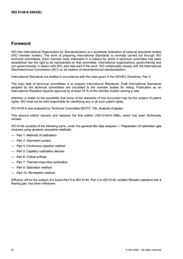 ISO 6145-6:2003 specifies a method for the continuous production of calibration gas mixtures, containing two or more components, from pure gases or other gas mixtures by use of critical orifice systems. By selection of appropriate combinations of orifices and with the use of pure gases, the volume fraction of the calibration component in the calibration gas mixture can be varied by a factor of 104. Additionally, it can be changed by a factor of 102 by changing the initial pressures in the orifice systems. The uncertainty of the method depends mainly upon the flow calibration method and the variations in temperature and outlet pressure. The relative expanded uncertainty in the volume fraction obtainable for a binary mixture (at a coverage factor of 2) is 3 %. If pre-mixed gases are used instead of pure gases, much lower volume fractions can be obtained. The mass flow rates or volume flow rates, from which the mass or volume fractions are determined, can be calculated and can be independently measured by a suitable method given in ISO 6145-1. The merits of the method are that multi-component mixtures can be prepared as readily as binary mixtures if the appropriate number of orifices is utilized, and that a large quantity of calibration gas mixture can be prepared on a continuous basis. The range of flow rates can be from several millilitres per minute to approximately 10 l/min. Although particularly applicable to preparation of gas mixtures at barometric pressure, the method also provides a means of preparation of calibration gas mixtures at pressures above barometric pressure.