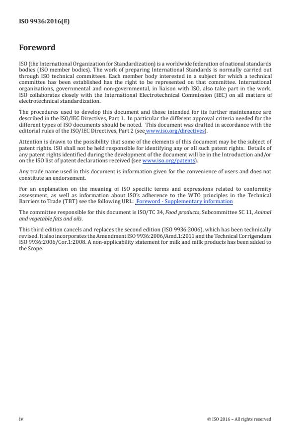 ISO 9936:2016 is a standard published by the International Organization for Standardization (ISO). Its full title is "Animal and vegetable fats and oils — Determination of tocopherol and tocotrienol contents by high-performance liquid chromatography". This standard covers: ISO 9936:2016 specifies a method for the determination of the contents of free α-, β-, γ-, and δ-tocopherols and tocotrienols (referred to jointly as tocols) in animal and vegetable fats and oils (referred to hereinafter as fats) by high-performance liquid chromatography (HPLC). For products containing tocopherol or tocotrienol esters, it is necessary to carry out a preliminary saponification. Milk and milk products (or fat coming from milk and milk products) are excluded from the Scope of this International Standard. NOTE A suitable method involving a cold saponification procedure is described in Annex B for information only.