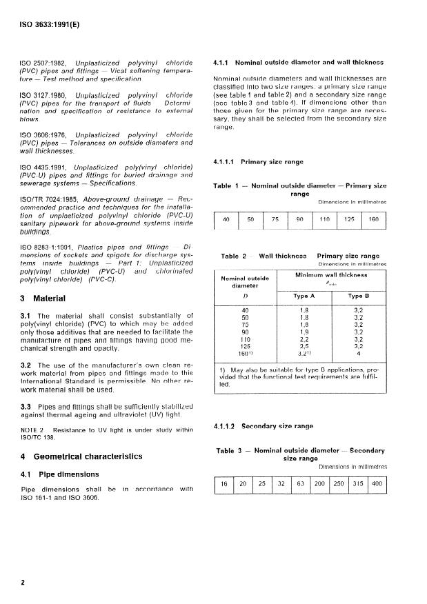 ISO 3633:1991 is a standard published by the International Organization for Standardization (ISO). Its full title is "Unplasticized poly(vinyl chloride) (PVC-U) pipes and fittings for soil and waste discharge (low and high temperature) systems inside buildings — Specifications". This standard covers: Unplasticized poly(vinyl chloride) (PVC-U) pipes and fittings for soil and waste discharge (low and high temperature) systems inside buildings — Specifications