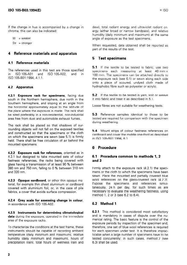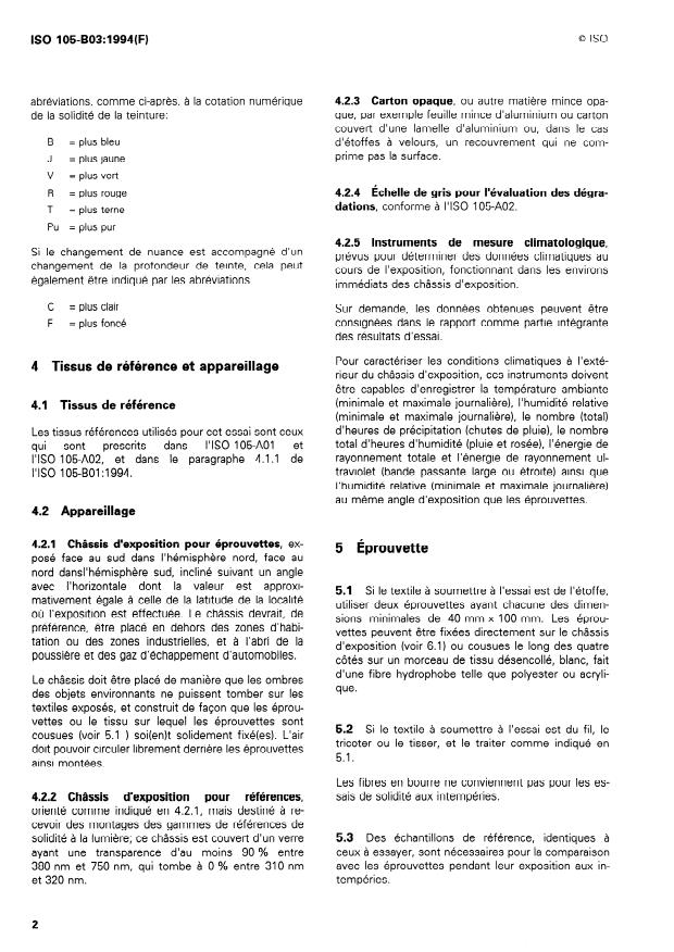 ISO 105-B03:1994 is a standard published by the International Organization for Standardization (ISO). Its full title is "Textiles — Tests for colour fastness — Part B03: Colour fastness to weathering: Outdoor exposure". This standard covers: Cancels and replaces the third edition (1988). Specifies a method intended for determining the resistance of the colour of textiles of all kinds except loose fibres to the action of weather as determined by outdoor exposure.