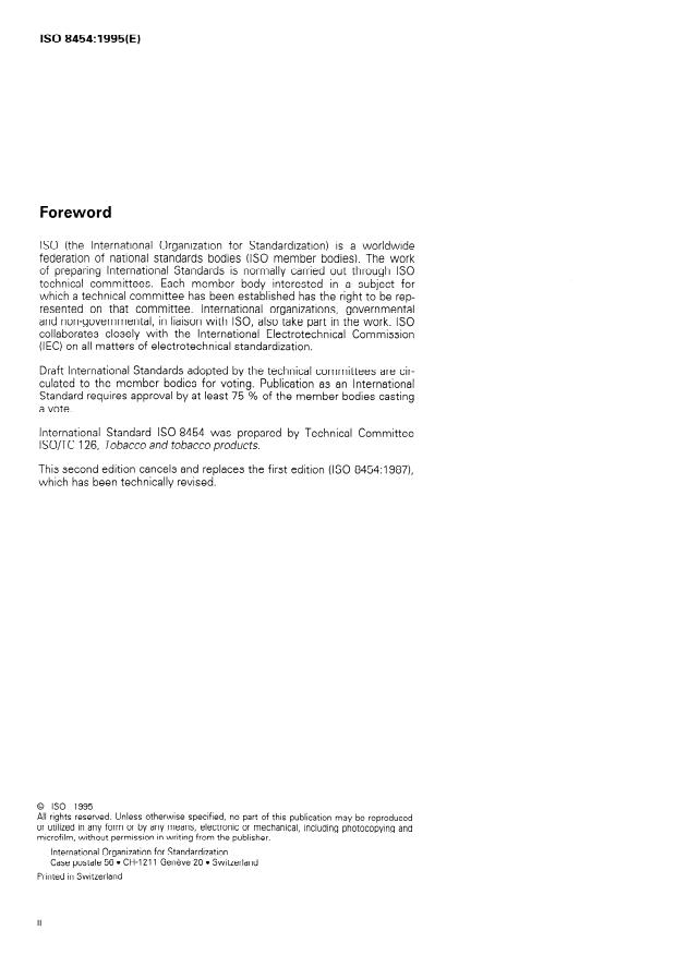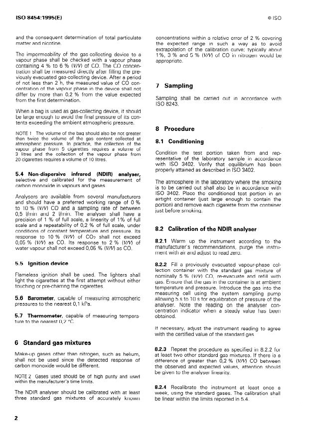 ISO 8454:1995 is a standard published by the International Organization for Standardization (ISO). Its full title is "Cigarettes — Determination of carbon monoxide in the vapour phase of cigarette smoke — NDIR method". This standard covers: Specifies a method for the determination of carbon monoxide (CO) in the vapour phase of cigarette smoke. Replaces the first edition, of which it constitutes a technical revision.