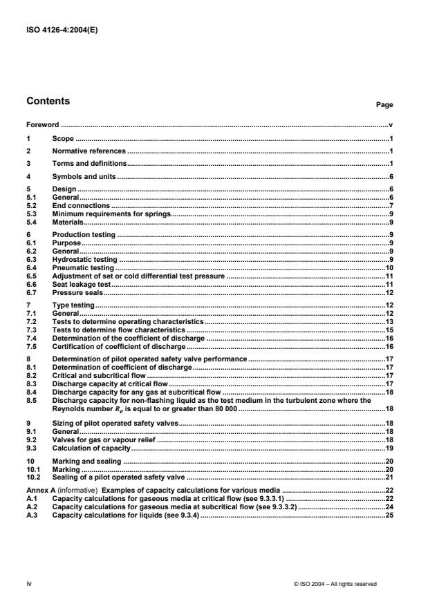 ISO 4126-4:2004 is a standard published by the International Organization for Standardization (ISO). Its full title is "Safety devices for protection against excessive pressure — Part 4: Pilot-operated safety valves". This standard covers: ISO 4126-4:2003 specifies general requirements for pilot operated safety valves, other than those covered in ISO 4126-1, irrespective of the fluid for which they are designed. In all cases, the operation is carried out by the fluid in the system to be protected. ISO 4126-4:2003 is applicable to pilot operated safety valves having a valve flow diameter of 6 mm and above which are for use at set pressures of 0,1 bar gauge and above. No limitation is placed on temperature. This is a product standard and it is not concerned with applications for pilot operated safety valves.