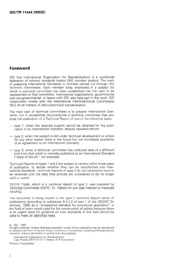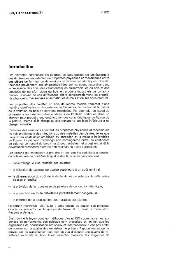 ISO/TR 11444:1995 is a technical report published by the International Organization for Standardization (ISO). Its full title is "Quality of sawn wood used for the construction of pallets". This standard covers: Gives information on the faults and features which may affect sawn wood used for the construction of pallets and provides guidance on their effects in relation to the physical and mechanical properties of both components and complete wooden pallets.