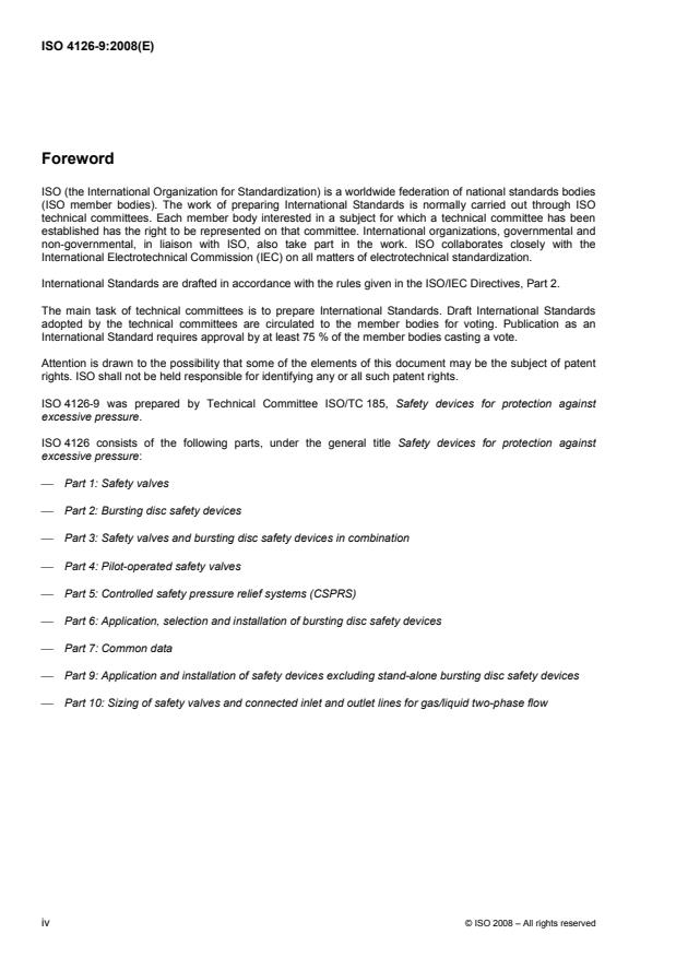 ISO 4126-9:2008 is a standard published by the International Organization for Standardization (ISO). Its full title is "Safety devices for protection against excessive pressure - Part 9: Application and installation of safety devices excluding stand-alone bursting disc safety devices". This standard covers: ISO 4126-9:2008 covers the application and installations of safety devices such as safety valves, safety valves and bursting disc safety devices in combination, pilot-operated safety valves and controlled safety pressure-relief systems for the protection of pressure equipment. ISO 4126-6 covers the selection, application and installation of bursting disc safety devices. ISO 4126-9:2008 describes the normative requirements for applications and installations of safety devices to protect static pressure equipment. The information contained in ISO 4126-9:2008 assumes single-phase flow of the fluid discharged from the safety device. ISO 4126-10 provides guidance specific to two-phase flow conditions. Equipment connected together in a system by piping of adequate capacity, which is free from potential blockages and does not contain any valve that can isolate any part, can be considered to be a safety system for the application of pressure relief. ISO 4126-9:2008 does not deal with other safety devices, such as safety related monitoring, control and regulation devices and other limiting devices allowed by some national regulations.