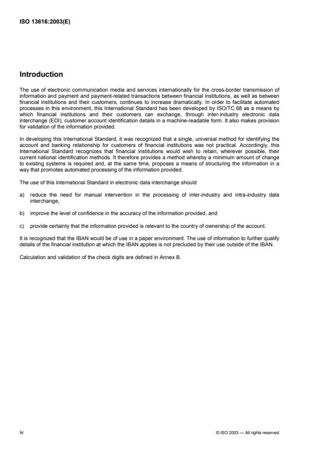ISO 13616:2003 specifies the elements of an international bank account number (IBAN), used to facilitate the processing of data in data interchange internationally -- in financial environments as well as within and between other industries. The IBAN is designed for automated processing, but can also be conveniently used in other media interchange when appropriate (paper document exchange, etc.). ISO 13616 does not specify internal procedures, file organization techniques, storage media, languages, etc. to be used in its implementation. Nor is it designed to facilitate the routing of messages within a network. It is applicable to the textual data which might be conveyed through a system (network).