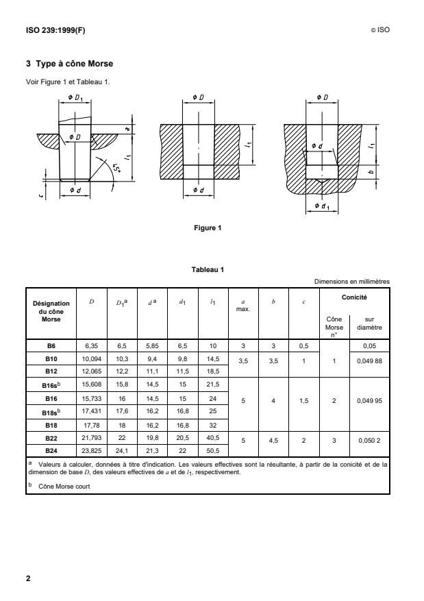 ISO 239:1999 is a standard published by the International Organization for Standardization (ISO). Its full title is "Drill chuck tapers". This standard covers: La présente Norme internationale spécifie les dimensions des cônes d'emmanchement pour mandrins de perceuse comprenant les deux types distincts suivants:a) type à cône Morse;b) type à cône Jacobs.Elle comporte, pour chaque type de cône d'emmanchement, un tableau donnant les dimensions.